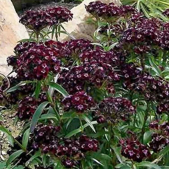 The Dianthus 'Sooty' is a cultivar known for its distinctive dark, ruby-black flowers and deep mahogany-coloured foliage. It is prized by gardeners for its spicy, fragrant blooms and its unique colour palette.